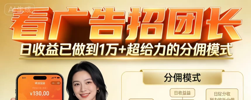- 看广告招团长,团队收益已做到日入1万,分佣模式超给力,错过拍大腿