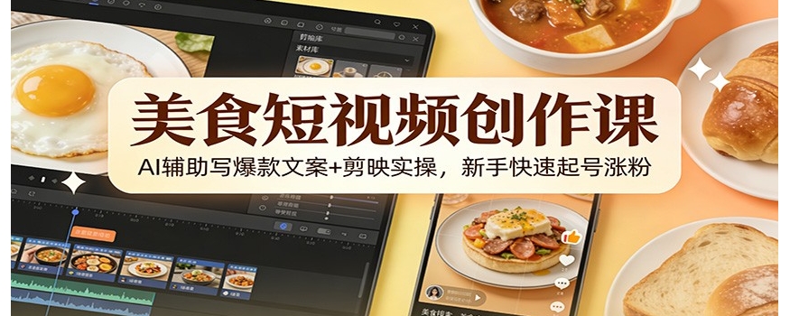 - 美食短视频创作课:AI辅助写爆款文案+剪映实操,新手快速起号涨粉
